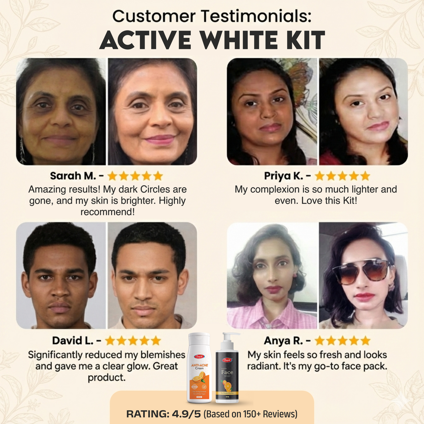 Active White Kit is a herbal skin brightening combo that includes a Face Wash and Acne Cream. It helps cleanse the skin, reduce acne and dark spots, control excess oil, and improve overall skin tone. With regular use, it promotes clearer, brighter, and healthier-looking skin and is suitable for all skin types. πΏβ¨